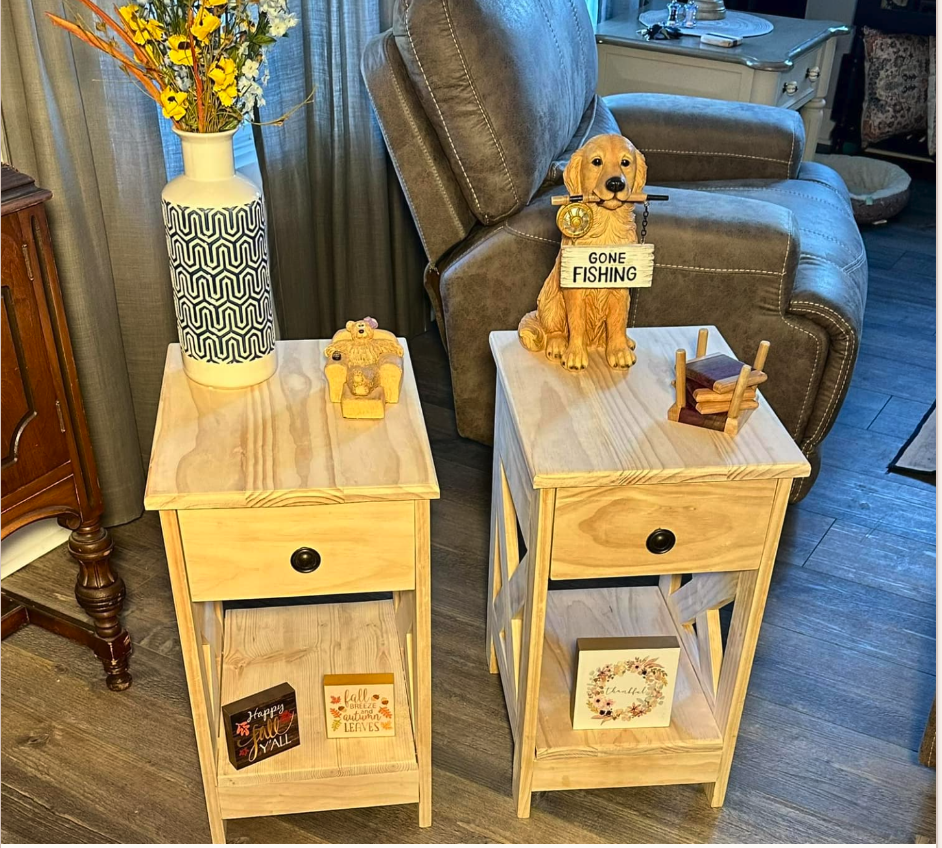 Beautiful wooden end tables featuring a single drawer and lower open shelf for storage. Perfect for any room.