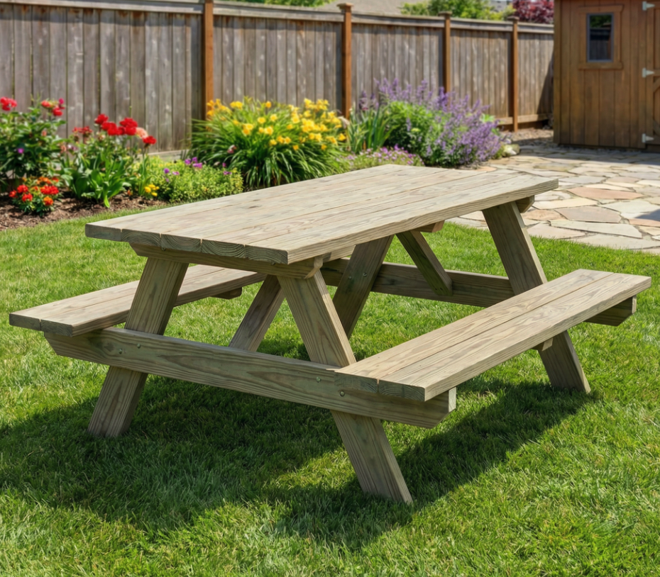 Traditional A-frame picnic table with attached benches. Seats 4-6 people comfortably. Weather-resistant construction.